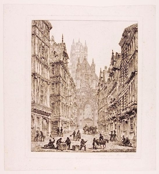 Editor: So, this is Axel Herman Haig's "Plaza de la Constitucion, Seville." It's a print, probably from the late 19th century, and it’s got such a busy, bustling feel. What strikes you most about this piece? Curator: The architecture dominates the social narrative, doesn’t it? Notice how the Giralda, once a minaret, now a Christian bell tower, looms over the Plaza. It represents a layering of power, a visual palimpsest of shifting cultural dominance, doesn't it? Editor: I hadn't thought of it that way. Curator: Consider who is represented in the foreground. Are they the colonizers or the colonized? How might Haig, as a European artist, be framing this space and the people within it? Editor: That makes you really think about the power dynamics that might be at play in what seems like a simple street scene. Curator: Exactly. It’s a reminder that art is never neutral.