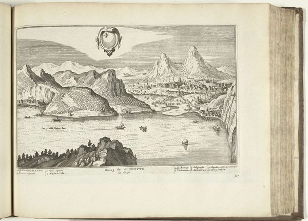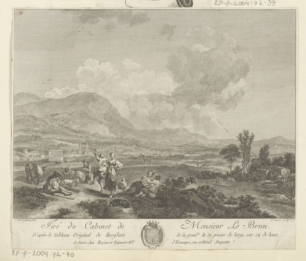 Curator: Oh, look at this engraving; there is such a quiet hum emanating from this image! Editor: Yes, that stillness speaks volumes. What exactly are we looking at? Curator: We are viewing Nicolas Perelle's "Gezicht op Grenoble," or "View of Grenoble," an engraving made sometime between 1641 and 1695, held here at the Rijksmuseum. I find myself wanting to breathe in that very air… Editor: What is interesting about the composition is how the landscape’s imposing size overshadows the figures populating it. There’s a formal reduction at play here—a diminishing of the human. I wonder about that effect? Curator: Perhaps Perelle wished to capture not the bustle of the city itself, but its majestic presence within a broader natural order. See how the town snuggles at the foot of that rocky bluff. Like a child at its mother’s feet, drawing sustenance and peace! Editor: Well, the artist has indeed used very economical strokes. Take notice of the mountainsides where short, repeated hatching lines build depth and volume—it's masterful how minimal intervention creates maximum impact. What would you say it adds to your visceral, subjective read? Curator: These lines give shape and texture to the mountains in a wonderful, subtle dance of shadow and light. They emphasize the solidity and permanence of Grenoble, framing the pastoral foreground! The human presence adds perspective and reinforces this sensation of serene harmony; it’s more of an observation than it is about human life. I can sense the pulse of existence in these stones, yes I can! Editor: Yes, this controlled interplay between topographical representation and subtle abstraction helps us feel both grounded in a real place while being aware of its symbolic dimensions— the weight of time pressing down. It transcends mere picture-making, wouldn’t you say? Curator: Absolutely. This piece whispers rather than shouts and lingers in memory like the echo of a distant song. I'd gladly hang this image in my chamber and watch how its form matures and settles with time! Editor: A fitting end, I'd say, and an attestation of the work’s inherent qualities to continually inspire us to explore novel readings and insights!