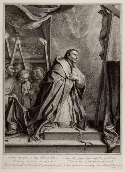 Curator: This is Giovanni Battista Pasqualini’s engraving of Saint Carlo Borromeo. Editor: It has a somber tone. Borromeo kneels in prayer before the crucifix, flanked by angels, while cherubic faces peek from the clouds. The angels almost seem to whisper encouragement. Curator: Borromeo was a cardinal and archbishop of Milan known for his work during the plague. The piece was likely commissioned to enhance his reputation as a saintly figure. Editor: Observe the symbols of faith: the crucifix, the cherubs, even the saint’s humble posture—all powerful reminders of devotion. Curator: And the political power such devotion represented. The imagery underscores the Catholic Church's effort to position Borromeo as an ideal figure. Editor: A complex portrait. Curator: Indeed, the blend of spiritual imagery and social messaging offers rich insights.