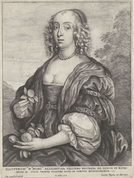 Joannes Meyssens created this portrait of Maria Ruthven using etching techniques, capturing a moment in the lives of 17th-century European nobility. Ruthven was a noblewoman of the period and wife to the artist Anthony van Dyck. In this portrait, the representation of Maria is more than a record. It reflects the conventions and expectations placed upon women of her status. The rosary she holds hints at the importance of religion in her life and perhaps a desire to convey piety, while her clothing and hairstyle are indicative of her wealth and position. Meyssens’ technique gives the print a tactile quality, drawing us into the details of Maria’s garments and jewelry. The portrait stands as a testament to the way identity was carefully constructed and communicated in the visual culture of the time. The artwork prompts us to consider the lives and identities of women who navigated the complex social and political landscape of their time.