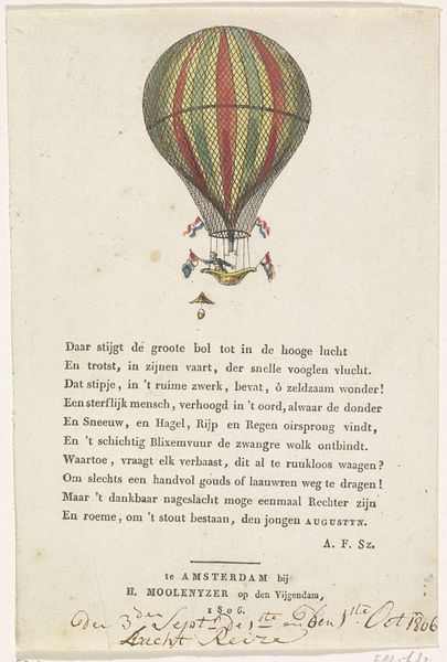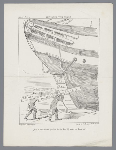 This anonymous print, dating from between 1855 and 1865, presents a hot air balloon titled "Ministerie Heemskerk". The balloon itself is rendered with a dense network of lines, creating a sense of volume and suggesting a fragile, almost collapsing structure. Figures huddle in the basket, their expressions obscured, contributing to an atmosphere of uncertainty. The composition is dominated by the balloon, an imposing form that dwarfs the figures below. The lines of the ropes, which connect the basket to the balloon, create a visual tension, suggesting a precarious balance. This tension destabilizes fixed meanings, and the arrangement and scale hint at a critique of power dynamics. The basket containing the "Ministerie Heemskerk" appears weighed down, seemingly burdened by its occupants. The semiotic weight of this artwork lies in its representation of political instability, a theme rendered through the formal qualities of line, scale, and composition. The lack of color focuses attention on the stark lines, enhancing the sense of unease and questioning the foundations of authority. The print challenges any fixed interpretation, engaging us in a dialogue about governance, representation, and the burdens of power.
