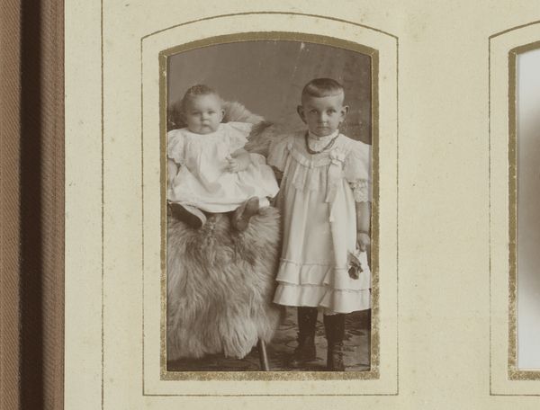 Curator: What an arresting image. This gelatin-silver print, dating from around 1910, presents such an intimate view into the domestic sphere. Note the detailed caption: "This is our boy, dog and cat and I am sticking my nose through the back of the chair. Burns just woke up so he looks kind of mussed up." Editor: Immediately, it strikes me as both humorous and slightly unsettling. The composition is wonderfully strange, that second peering face in the background paired with a blurry cat really make you work for it. I sense some powerful psychological projection and narrative fragmentation going on. Curator: Absolutely. Given the historical context of early 20th-century photography, there’s also an element of performance here. Families, seeking to document themselves, used this new technology to create particular types of representations—ones rooted in prevailing gender and class expectations. I’d say we should see this work in relation to broader constructs of domesticity. Editor: And consider how animals were deployed as symbols in similar portraiture! The dog represents loyalty and guardianship; the cat, perhaps, domestic comfort. Placed upon the chair, an animal throne is effectively built by and around these figures and subjects. Note that each member is strategically arranged and staged. There is symbolism that creates an allegory beyond the surface. Curator: Right! Furthermore, one can consider that someone else is included, looking at who's taking the photograph: an insider or an outsider? I read their physical position and lack of inscription into the formal portrait as an assertion of parental control and visibility in the construction of this nuclear family ideal. Editor: Yes, there's an emotional truth to this piece, as it reaches past pure realism into complex expressions that speak across the ages. Despite the antiquated setting and tonal qualities, our access is both instantaneous and emotionally layered. I suspect each generation re-interprets those symbols as it sees itself, to better grasp their cultural continuity across time. Curator: The enduring appeal and somewhat disturbing aspects of family portraiture definitely come to mind as a theme, here. This piece shows both the social demands of representing oneself and one's relatives with both the possibilities of control and candor. Editor: Absolutely. An image for every memory palace.