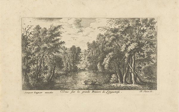 Ignatius van der Stock created "Bos," an etching, sometime between 1660 and 1760. What immediately strikes us is how the composition leads the eye, directing our gaze through a dense woodland clearing to a distant horizon. Van der Stock's use of etching to create contrasting textures captures the interplay of light and shadow, and transforms a natural scene into a rich visual experience. The lines become more than just descriptive; they begin to evoke a sense of depth. The artist uses the structural interplay of dark and light to create a semiotic system of visual information and to suggest forms and spaces. The composition, dominated by the framing of trees, invites the viewer to consider the relationship between the observer and nature. It is an invitation to look deeper into how we perceive and structure our understanding of the world. The etching is not simply a representation of trees, but a carefully constructed visual language designed to engage us in the very act of seeing.