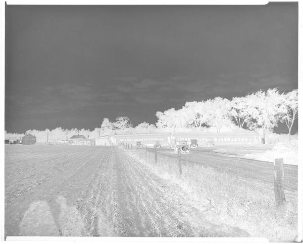 Curator: The Harvard Art Museums hold this evocative, though untitled, print by Lucian and Mary Brown, depicting people walking on a snowy path. Editor: It’s haunting. The inverted tones and stark contrasts give it an otherworldly quality, like figures in a dream. Curator: Dreams are apt. This photogram, meaning it's made without a camera, allows direct impression. They placed objects, perhaps even snow, onto photographic paper and exposed it to light. Editor: The bare trees reaching up – a symbol of resilience, perhaps? And the figures feel so small, almost ghostlike, walking into the unknown future. Curator: Or perhaps they represent the everyday people. The Browns focused on ordinary citizens, documenting life, not trying to aggrandize. Editor: Even without a concrete story, there is something primal here. The light and dark, the journey, the quiet solitude... it all resonates. Curator: Precisely! The Browns are reminding us that there is art in the everyday struggle. Editor: Yes, and maybe a chance to reflect on our own path too.