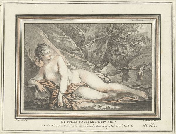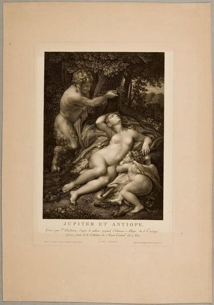 Curator: Pietro Bonato created "Venus Playing with Cupid." The artwork can be found at the Harvard Art Museums. Editor: My first impression is that it's both playful and a bit unsettling. The stark contrast and the intimate setting create an interesting tension. Curator: Considering the time Bonato was working, around the late 18th, early 19th century, the depiction of Venus and Cupid reflects the prevailing social attitudes towards mythology and the idealization of beauty. Editor: I see this through a contemporary lens, and I am struck by how the image perpetuates a patriarchal gaze, objectifying Venus while simultaneously infantilizing her through her interaction with Cupid. The piece also reveals the historical subjugation of female identity. Curator: Absolutely. These pieces also functioned within a system of patronage, so these prints were for specific audiences, reinforcing social status and cultural capital. Editor: Precisely. It's a potent reminder of how art serves as both a mirror reflecting societal values and a tool that shapes them. Curator: Thank you. It really pushes you to think. Editor: Indeed.