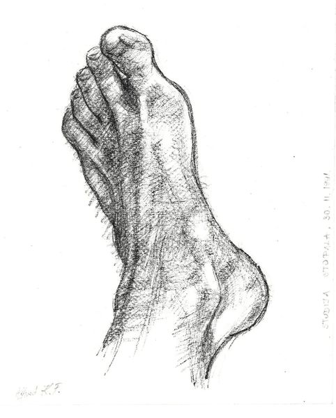 Editor: So, this is Alfred Freddy Krupa's 1995 pencil drawing, "Studying my own foot." It feels quite intimate, almost like a secret glimpse into the artist's world. What do you see in this piece? Curator: The foot, so often overlooked, becomes a landscape of self. Feet carry us through life; they're symbols of journey, grounding, and even humility. The act of studying one’s own foot is particularly resonant. It suggests introspection, a return to the self. The delicate lines of the pencil create a vulnerability. Editor: Introspection, I like that. But why focus on the feet specifically? Is there some symbolic significance beyond the obvious connection to travel? Curator: Consider the symbolism of the foot across cultures. In many traditions, washing feet is an act of purification and service. Think of the foot as a foundation, the very support upon which we build our lives. The artist, by focusing on this often-unseen part of himself, invites us to consider our own foundations, our own journeys. The close study implies great care; each line, each shadow meticulously rendered. Is it an act of humility? Self-acceptance? What is *your* foot a symbol of? Editor: Hmm, grounding, journey, foundation… I never thought of it that way. The drawing makes you contemplate your own body in a new light, and how much history it carries within it. Curator: Exactly! It's not just a foot, but a record. An image containing memory and motion; it's a symbol rich with personal and universal meaning. The choice of graphite reinforces this idea. Graphite: the lead that leaves its trace on the paper like steps. Editor: That's fascinating. I’ll never look at a foot the same way again! Curator: And perhaps that's the point. Art shifts perspectives, doesn't it?
