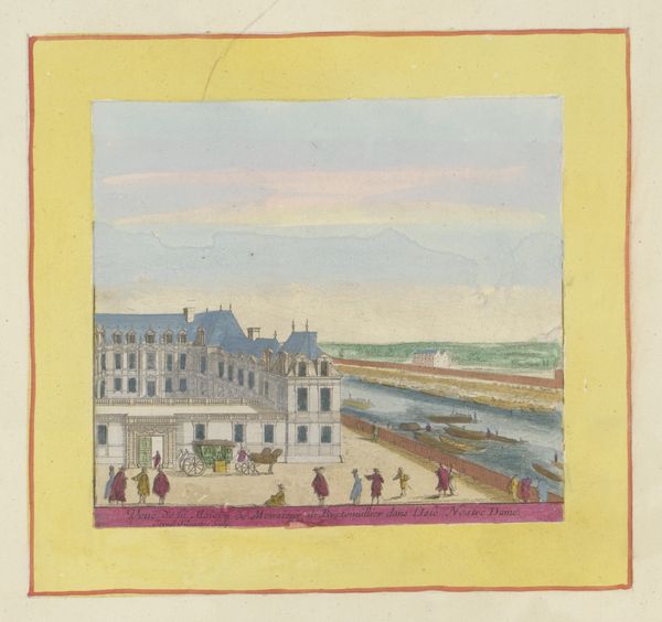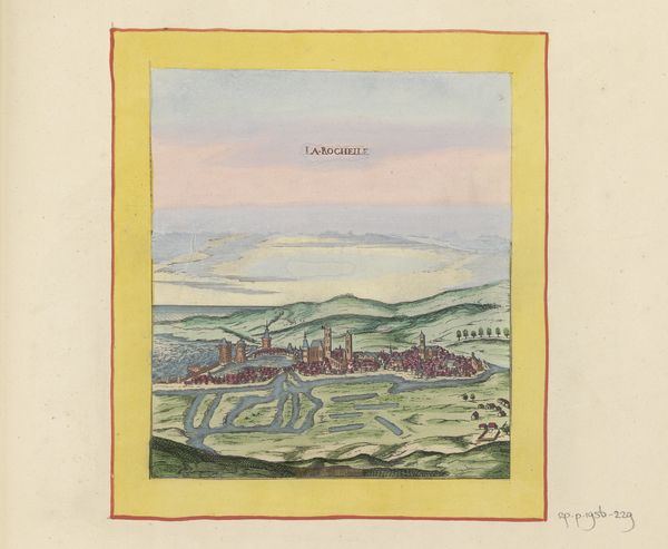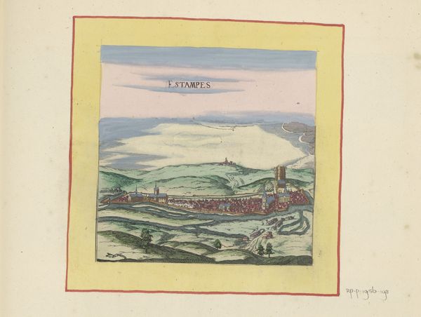 Editor: We’re looking at "Gezicht op Amboise," a watercolor print from 1657. It's a cityscape that feels both detailed and somehow dreamlike with its soft colors and careful rendering. I’m particularly struck by the sky and how soft the clouds look. What do you see in this piece? Curator: The charm of this piece lies, for me, in its tranquility. The artist captures Amboise with a tenderness, don't you think? There’s an almost miniaturist quality in the way the details of the city are rendered. It's a time capsule. The light is just right; it sets a lovely stage and speaks of bygone days. Can you see the balance between nature and city? It's quite lovely, actually. Does it feel more factual, or more of a mood for you? Editor: I agree, it feels like a mood more than pure record-keeping. The details are precise, but they are bathed in that almost hazy, watercolor light, so it gives the piece an idealized aura. Like the artist is showing a memory. Curator: Yes! It invites you into this gentler, less hurried pace. It’s saying "pause." Watercolor prints allow for subtle color gradations. Do you think this piece reflects some characteristics of Baroque? Think of dramatic play with color! Editor: It's making me think more about perspective too. It's interesting how the artist chose to view Amboise from this angle, focusing on the bridge, and I agree, that gentle shift in the light! That perspective is new for me. I was too focused on the colors before. Curator: See how even a simple cityscape opens new doorways into art! That's why art is always alive.