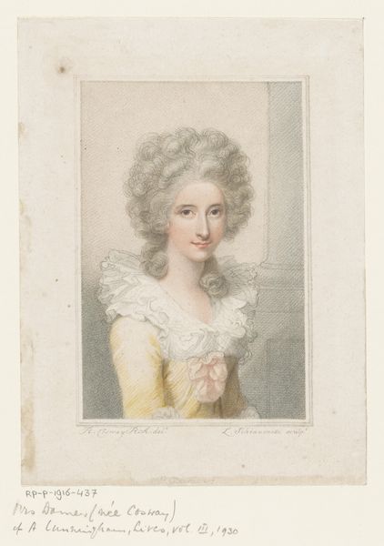 Editor: Here we have Thomas Gainsborough's portrait of Mrs. Susanna Gardiner. The dark background and her somber expression give it a rather serious mood. How do you interpret this work? Curator: Well, consider the context. Gainsborough, a sought-after portraitist, painted members of the British elite. Look closely at Mrs. Gardiner's attire – it speaks volumes about her social standing and the expectations placed upon women of her class. Editor: So, her clothing is a representation of her social role? Curator: Exactly. The portrait becomes a study of identity and the constraints of gender within a specific historical framework. What does it tell us about female representation then? Editor: It's fascinating to think about art as a lens through which we can examine social structures. Curator: Precisely! It prompts us to question who is represented, how, and why.