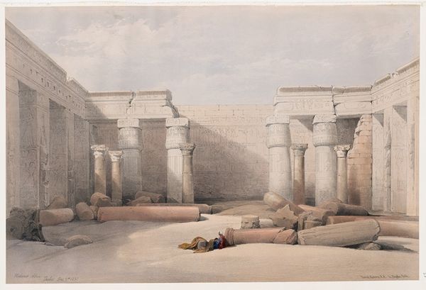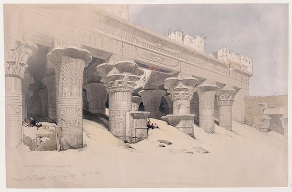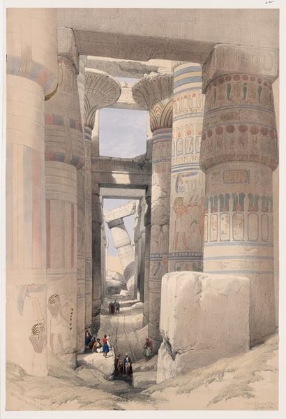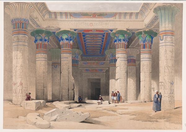 Curator: What strikes me most is the palpable sense of awe. The figures, dwarfed by the monumental statues, offer an immediate connection to our own fleeting existence within the grand scope of history. Editor: Indeed, this watercolor by David Roberts, dating from between 1846 and 1849, portrays the "Excavated Temple of Gyrshe [Gerf Hussein], Nubia." Roberts was known for his detailed architectural studies, and here he captures not only the grandeur of the temple, but also its appropriation by Western eyes during the age of exploration. Curator: Precisely. The Western gaze is evident, not just in the act of documentation, but in the figures themselves, almost staged. It's as if they are actors in a play, positioned to emphasize the scale and exoticism for a European audience. The light is strategically employed to cast an air of mystery and revelation upon the site. Editor: Note also the deliberate play with perspective. Roberts employs linear perspective to guide the eye deep into the temple's interior, exaggerating the already immense scale. Consider, too, that this “excavation” is not a neutral act; it speaks volumes about colonial power and the desire to possess and understand ancient civilizations. Curator: Yes, but beyond the colonial context, there's also something eternally human about the scene. We, like those figures, are drawn to the symbolic weight of these massive structures. The pharaohs, frozen in stone, are symbols of permanence, inviting introspection. Do we also wish to achieve such permanence? Editor: Roberts provides us with insight to how such an aesthetic was marketed and consumed in 19th-century Europe. The watercolor was then reproduced as lithographs to reach a larger audience, influencing popular perceptions of ancient Egypt. Curator: Understanding the historical lens deepens our appreciation for the emotional layers this image contains. We are reminded that art always engages in an interweaving of past and present. Editor: Ultimately, Robert’s painting underscores art’s role not merely as historical record, but as a cultural artifact. We should consider its production, reception, and lasting political undertones, even today.