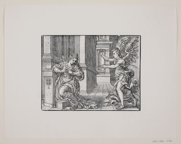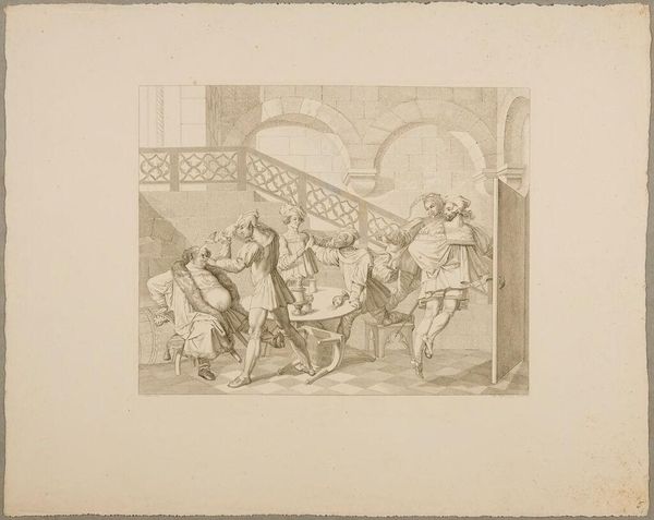 Curator: This is Ferdinand Ruscheweyh's "Faust Visiting Gretchen in Prison," currently held at the Harvard Art Museums. The print offers a glimpse into a dark chapter of Goethe's Faust. Editor: The overall mood is somber, of course. Gretchen's illuminated by an angel, while Faust appears frantic. It’s a striking contrast between divine hope and earthly despair. Curator: Ruscheweyh's focus on line work, a hallmark of printmaking, emphasizes the stark prison environment and the figures' emotional states. Consider, too, the socio-economic context of access to art—prints made art more accessible. Editor: The imagery is powerful. Gretchen, kneeling with hands raised towards an angelic vision, evokes themes of redemption, while the skull at Faust's feet hints at mortality and the dire consequences of his actions. Curator: Absolutely, and the very act of printmaking—the labor, the materials, the circulation—democratized both the image and the narrative of Faust, engaging a broader audience in moral and philosophical questions. Editor: It's a potent reminder that visual symbols can echo across centuries, inviting new readings and interpretations. Curator: Indeed, and the materials used to produce art can provide a similar lens into the past. Editor: A fascinating blend of materiality and meaning.