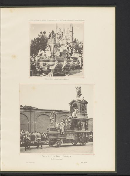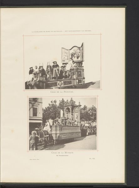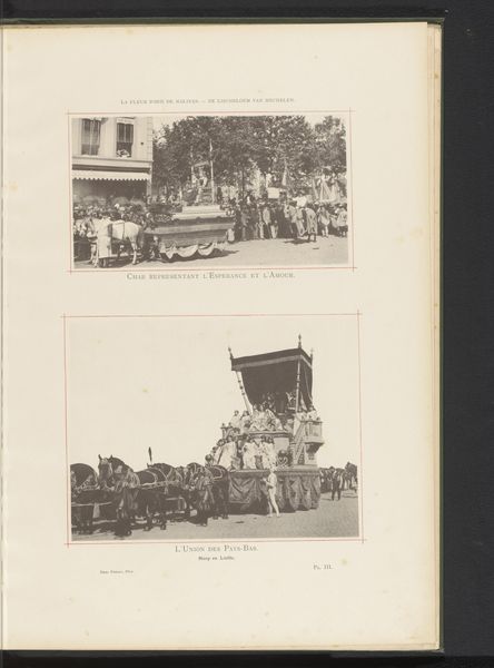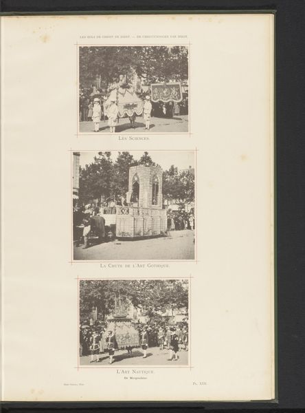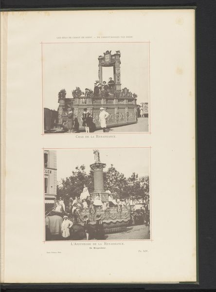 Curator: This fascinating photographic print by Frères Dero captures "Twee gezichten op de optocht van Landjuweel ter ere van het vijftigjarig bestaan van de Academie d'Archéologie de Belgique in 1892 in Antwerpen"—that is, two views of the Landjuweel procession celebrating the 50th anniversary of the Belgian Academy of Archaeology. It's dated 1892. What’s your initial reaction? Editor: There's a wonderful symmetry to the framing of these two street scenes—the architectural facades set at similar angles, and the lines of the trees in the middle distance provide this quiet verticality. The tonal range, of course, is limited, giving the image a restrained, almost nostalgic quality. Curator: Indeed. It is more than nostalgia; the event depicted was a symbol of Belgian national pride, linking archeology with cultural heritage. In this historical context, the print reinforces a sense of national identity formation that was exclusive, focused on whiteness and Europeanness in line with the biases of that era's coloniality. Editor: The semiotic weight is distributed quite elegantly across the composition. In the top image, note how the solid form of the statue contrasts with the movement in the lower image—particularly that undulating "sea" surrounding the ship. The contrast in shape directs our eye accordingly to narrative elements of permanence, the rootedness of tradition versus the openness, say, of future or promise. Curator: Absolutely. I interpret that symbolism with a critical eye to issues of representation and access in institutions of power. Who got to participate in this performance of national identity, and who was excluded based on class, race, gender and other social stratifications? It is imperative to consider Landjuweel, not as neutral expression, but embedded in 19th century cultural politics. Editor: While you emphasize the socio-political elements, I also appreciate how this photograph is meticulously structured. The distribution of dark and light—the way the canopies offer dappled shade which unifies, as it were, the scene—makes the visual storytelling engaging. Curator: Agreed, recognizing this, we can remember art's ability both to shape perceptions and potentially subvert the power dynamics it initially embodies, to forge new representations inclusive and equitable. Editor: Thank you, this has provided new perspective on how we may appreciate, and newly assess, how to analyze these streetscapes from a period defined both by cultural tradition, and a commitment to visual precision.