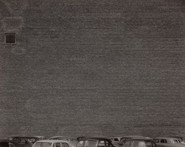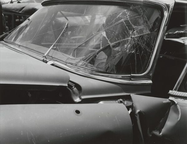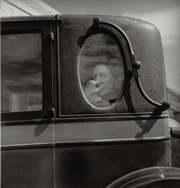 Nathan Lerner captured this black and white photograph titled "San Francisco Bay Ferry". The photograph is taken from the interior of a car, framing the outside world through the windshield and rearview mirror. Lerner, who was born in 1913, came of age during the Great Depression and World War II. This backdrop undoubtedly shaped his lens and creative eye. The inside of the car offers a sense of American industry and prosperity. The exterior world seems to hint at the promise of progress, while the figures by the water's edge suggest themes of family, togetherness, and perhaps even the hopes for a brighter future post-war. The photograph has a distinct visual and emotional depth, where ideas about social identity, dreams, and the artist’s individual experience come together. It leaves us contemplating the complex relationship between personal identity and the collective American experience.