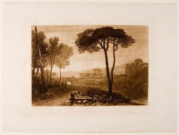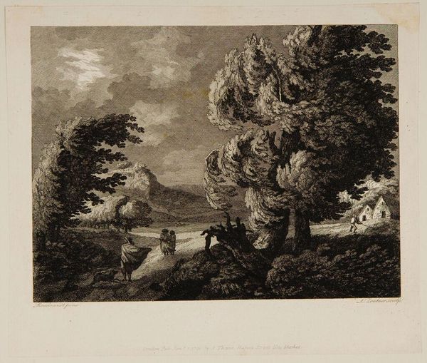 Curator: Alexandre Calame created "A Peasant and His Dog by a Stand of Trees." The sweeping vista gives way to a very somber, almost menacing quality. Editor: The stark contrast certainly contributes to that feeling. Note how the artist uses the trees to frame the peasant and his dog, who seem dwarfed by the landscape. Curator: Precisely, the composition emphasizes the formal elements—the balance between light and shadow, the texture of the foliage, which draw the eye across the whole picture plane. Editor: It’s hard not to think about the realities of rural life in 19th-century Europe. The work perhaps speaks to the peasant’s relationship with the land and the socio-economic forces at play. Curator: I see it more as an exploration of form. The subject is simply the vehicle. Editor: I think both interpretations enrich our viewing experience. Curator: Indeed, it's a testament to how different lenses reveal new facets.