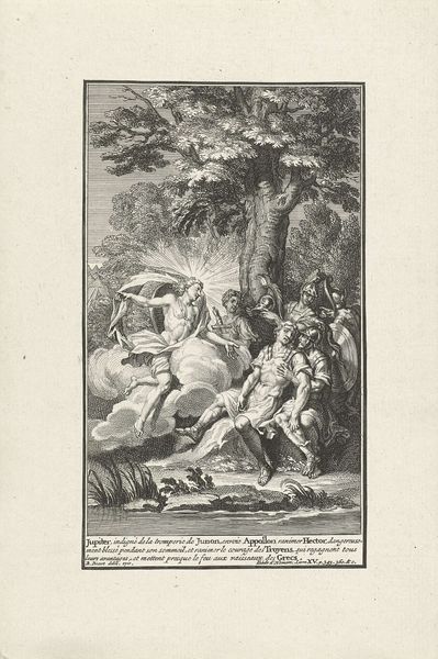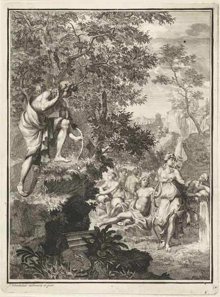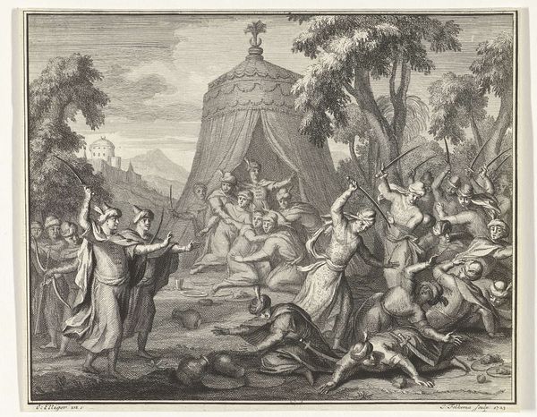 Curator: This engraving, dating from around 1702 to 1767, is entitled "Telemachus redt Antiope," here on display at the Rijksmuseum. Jacob Folkema is credited with the work. Editor: It’s quite a scene! A chaotic hunt rendered in precise lines, creating a feeling of drama amidst a very busy composition. The energy is undeniable, particularly given that it's just ink on paper. Curator: Indeed. Consider the baroque fascination with line and the emphasis on capturing movement through the etching process. Notice how the various weights and densities of lines shape form and evoke dynamism in the figures. There are hunters, hounds, a wild boar, and our namesake characters caught in a moment of crisis. Editor: Seeing the historical subject depicted—this rescue narrative with Telemachus freeing Antiope from the boar—makes me think about the political undercurrents. Were there societal structures the work alluded to or upheld? What were the conditions that supported the patronage of works with classicist imagery? Curator: Certainly. The imagery evokes classical ideals of heroism and beauty, popular during this era. Engravings such as these played a vital role in disseminating these ideals to a broader audience through printed materials. This print could have circulated as part of a larger series illustrating classical literature, shaping public perception. Editor: So, the materials – copper, ink, paper, the very method of creating multiples, each bears a layer of historical influence. Every copy played a part in distributing ideology as much as art. You could say these images acted as cultural currency. Curator: Precisely. It is a great reminder of how seemingly simple materials are instrumental in delivering broader ideas and aesthetics to a consuming public. Editor: Thank you, considering Folkema’s artwork beyond its surface helps me understand more about this visual era. Curator: Agreed, a reminder that an artistic piece and even its means of production are so much more than the sum of their material parts.