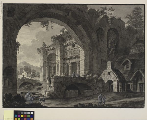 Curator: This is Robert Adam’s “Architectural fantasy of a ruined bridge in a landscape,” a tempera drawing from 1777. Look closely, and you'll see incredible detail. Editor: My first impression is one of melancholy. The muted colors and crumbling architecture evoke a sense of lost grandeur and time’s relentless march. Curator: It's striking how Adam uses the ruined bridge as a potent symbol of societal decline, especially in light of contemporary social and political turmoil in Europe at the time. The picturesque aesthetic almost romanticizes the decay. Editor: Yes, decay becomes an element within the beautiful. Notice how the architectural motifs—the arches, the towers—still hold echoes of classical ideals even as they are fragmented? There’s a visual tension there, an acknowledgment of a lost golden age. Curator: And consider who gets to look at and interpret that decay. The small figures give scale and perspective, but also bring up questions about spectatorship and power. Who gets to contemplate this ruin, and whose labor built what has fallen? Editor: Those figures are fascinating! We have one near the base who appears to be gesturing upwards as if admiring it, but what’s arresting to me are the figures by the waterline embracing each other as the ruins reflect. That is powerful, human. Curator: It does emphasize a tension—between the enduring symbol of imperial strength and the very human, temporal lives playing out at its base. Editor: Absolutely. This wasn’t merely a representation of landscape; it offered reflections on permanence and change. This image is, as the youth would say, 'deep'. Curator: It does indeed provoke critical reflection, demonstrating how Neoclassicism often subtly addressed its present through historical or symbolic narratives. The question it asks is whether we, the viewers, learn anything from those histories or repeat past mistakes. Editor: I like that--it makes me see it less as a scene of beautiful decay and more a kind of quiet warning. It reminds us to learn.