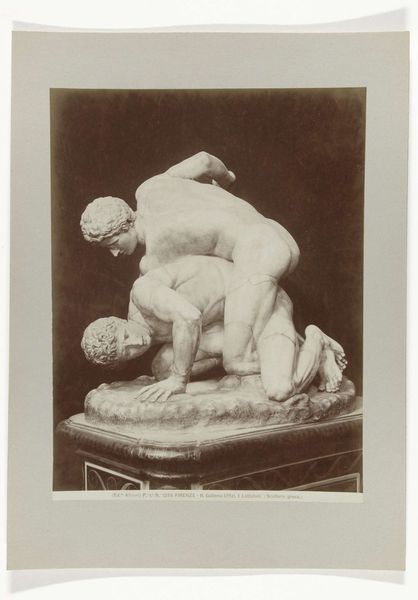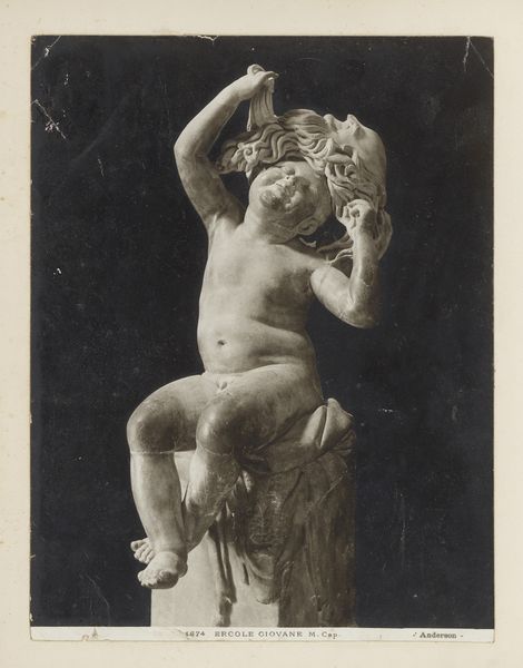 Editor: This photograph by James Anderson, taken sometime between 1857 and 1875, captures a marble sculpture of Cupid and Psyche now housed at the Rijksmuseum. The stark contrast in the photo gives the sculpture an almost ethereal quality, making the figures seem like they are emerging from the darkness. What strikes you about this image? Curator: Immediately, the intertwining of the figures grabs my attention. It’s not just the physical embrace but what that embrace *represents* that fascinates me. In the context of art history and its enduring impact on our visual language, this scene depicts a pivotal moment of reunion, of love and soul finally connecting. Think about the loaded symbolism: Cupid, or Eros, representing passionate desire; Psyche, representing the soul. The kiss, framed within such exquisite Neoclassical ideals, becomes an allegory of profound, spiritual connection. How do you interpret Psyche's hand gesture? Editor: She seems hesitant, almost like she is discovering something new. Curator: Precisely. Her touch conveys a mixture of awe, trepidation, and burgeoning understanding. The sculpture itself has its roots in ancient narratives of transformation. What happens when these narratives, already laden with symbolism, get reinterpreted and reshaped by artists centuries later? Editor: It layers meanings, connecting different periods of artistic and cultural expression. It becomes a conversation between the past and the present. Curator: Exactly! Neoclassicism was obsessed with retrieving and reshaping antiquity, but photography introduced another level of replication. Anderson’s image reframes a reproduction and becomes another object to study. How does understanding that cultural journey affect your view of the sculpture itself? Editor: I appreciate how it makes a classical ideal tangible and brings the old story to the modern age, one visual encoding at a time.
