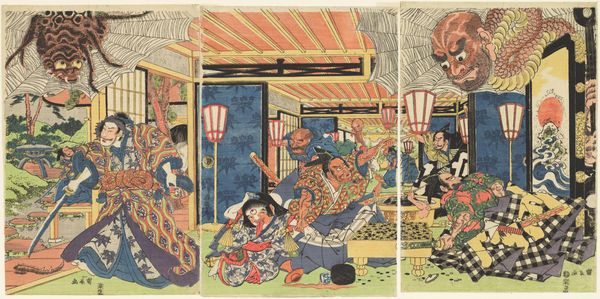 Editor: This is "Foreign Business Establishment in Yokohama," a color woodblock print made in 1861 by Utagawa Sadahide. There’s so much happening! It’s like stepping into a very busy diorama, and what jumps out to me is just how different all of the figures look in terms of fashion, and how everyone is engaging in their own transactions without any acknowledgement of one another. What's your interpretation of this piece? Curator: It's fascinating how this print encapsulates the complex interactions occurring in Yokohama at this time. What you're observing isn't merely a busy marketplace but a visual record of the clashing cultures and the burgeoning international trade imposed after the opening of Japan. Note how Westerners occupy positions of perceived importance and leisurely engagements like gambling, whereas Japanese figures are rendered almost subservient. It prompts a question about whose perspective is centered here, doesn't it? Editor: That power dynamic is something I hadn’t picked up on initially, I was focused more on the details of the setting! The varied depictions of work feel somewhat class-related. Curator: Exactly. Consider the very existence of this image and who it might have been intended for. This print becomes a commodity itself, offering a controlled glimpse into this "exotic" space. It satisfies a certain curiosity, perhaps even reinforces existing social and political hierarchies. It speaks volumes about how cultural encounters were mediated and consumed. What kind of message would that send to viewers at the time? Editor: Wow, I hadn't considered the print itself as being part of that exchange, as a transaction and form of controlling the narrative, which really frames my perception of it! Curator: It shows how the politics of imagery intersect with art, commerce, and cultural identity in 19th century Japan.