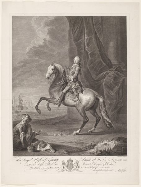 Curator: We're standing before "George Washington met de Amerikaanse Onafhankelijkheidsverklaring," a print made between 1780 and 1781 by Noël Le Mire, here at the Rijksmuseum. It depicts Washington holding the American Declaration of Independence. Editor: The initial impression is somber; a dignified portrait in what seems like a vulnerable moment in the field. I see contrasts in light and shadow creating a dramatic feel. Curator: Absolutely. Placing this print within the context of late 18th century revolutions, we can examine Washington as a figure of colonial resistance and nascent American identity. How does the text on the Declaration intersect with notions of self-governance and challenging established power structures of its era? Editor: Visually, the contrast between the detailed engraving of Washington and the relatively less defined background is striking. There's almost a sense of semiotic emphasis; the document becomes as much of a focal point as Washington himself, but this visual hierarchy doesn’t particularly convince me. It seems, visually speaking, a little chaotic for neoclassicism. Curator: Yes, and if we apply a feminist lens, for instance, we could question the deliberate exclusion of marginalized groups – enslaved people, women – whose labor and voices were essential to the revolutionary effort, yet rendered invisible. Editor: Indeed. Zooming into the compositional elements, note the way his gesture leads the eye toward that scroll. And consider the strategic use of shadow to emphasize his presence, highlighting the role of leader. Curator: Let’s also think about the role of prints as disseminators of information and propaganda. How did images like this contribute to the construction of a national narrative? Who was its audience, and what impact did it have on shaping public opinion about the American Revolution both within the colonies and in Europe? Editor: It makes one wonder if a deconstruction would actually do the work a service here. It's far from the idealized portrait of Washington that I might expect. Interesting to consider what that chaos might be suggesting. Curator: Understanding the historical context certainly enhances how we perceive not just the man, but the burgeoning ideals represented in that Declaration he holds. Editor: Yes. While dissecting the compositional and structural elements offers one perspective, overlaying it with an awareness of its time enriches the visual and expands interpretations.