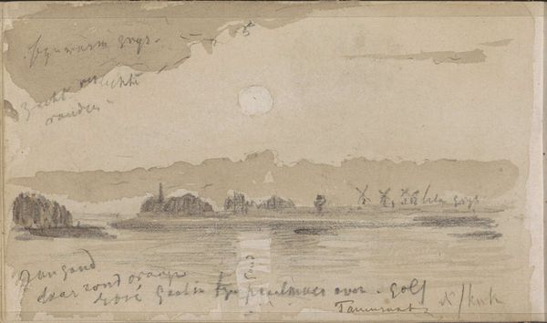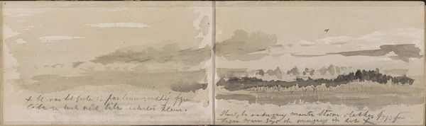 Editor: So, this is Johannes Tavenraat’s “Duck Hunt on the Wollefopse Plas near Rotterdam,” created sometime between 1864 and 1868. It’s a drawing in ink and watercolor on paper and something about the muted tones makes me feel the stillness of the water... What really catches your eye when you look at this piece? Curator: Oh, Tavenraat! I find myself drawn into the misty atmosphere he conjures with such a delicate touch. It reminds me of half-remembered dreams and the feeling of a cold, damp morning breaking across the flatlands. You know, there’s almost something spiritual about these open vistas. Does the placement of the ducks strike you? Editor: A little bit! The composition, especially the flock of birds in the distance, feels intentional. Do you think it has symbolic significance? Curator: Possibly! Those birds might represent a fleeting moment, the soul’s desire for freedom or a more simple existence in contrast with encroaching industry of the Rotterdam harbor visible at the horizon. Or perhaps he simply enjoyed watching birds, sketching as one might keep a visual diary? He offers us a vignette and invites us to imagine our own stories within the frame. What are you imagining as you consider those little specks? Editor: I like your "visual diary" idea! The quick strokes capture an everyday moment, and they avoid being overly precious or sentimental. Curator: Exactly. It's a celebration of seeing, feeling, being, even. These small observations become, collectively, our world. Do we dare claim it's optimism or only the document of the eye of the hunt? Editor: Interesting. I had only thought about how calm this drawing felt. Now I'm considering deeper, conflicting layers. Curator: Isn't that wonderful? It reveals something different each time, based on your current landscape and associations. It makes art feel very, very alive.