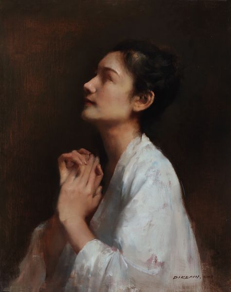 Fujishima Takeji painted this dreamy portrait of a woman, sometime in the late 19th or early 20th century, probably with oil on canvas. You can see the artist’s hand in the soft, blended brushstrokes that create a hazy, atmospheric effect. It's like the whole image is caught between waking and sleeping. The color palette is mostly earth tones, with warm browns and reds dominating the composition. Look at the way the light catches the woman’s face, creating subtle gradations of tone that give her features a delicate, almost ethereal quality. The surface has a kind of hazy texture, which softens the whole image. You can imagine him using soft brushes to blend the tones together, creating a sense of depth and atmosphere. This piece reminds me of the work of Symbolist painters like Odilon Redon, who were interested in exploring the inner world of dreams and imagination, and I think there's a beauty in art that embraces ambiguity.
