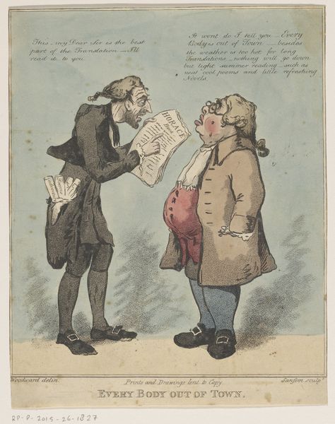 This satirical print, by an anonymous artist, presents William Pitt and John Bull around a peep-show box, rendered with etching and watercolor. The composition is immediately striking: the contorted posture of John Bull, peering into the viewing box, is juxtaposed with William Pitt’s manipulative stance. The artist employs caricature, exaggerating features to create a grotesque effect. The color palette is restrained, with muted tones accentuating the moral decay suggested by the image. Formally, the lines are sharp and defined. It enhances the critical tone of the scene. This work critiques the political climate of its time. The artist challenges fixed meanings by turning public figures into objects of ridicule. The print destabilizes established values, prompting viewers to reconsider their perceptions of power and representation. It serves as a potent reminder that art does not offer singular meanings, but rather invites ongoing interpretation and re-evaluation.