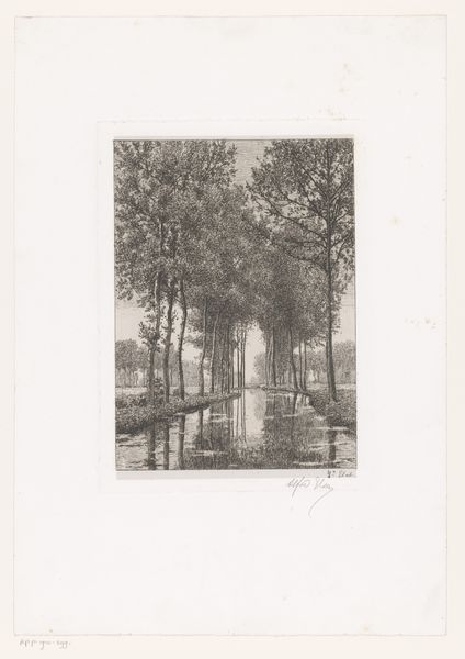 Editor: This is "Landschap met rivier," or "Landscape with River," an etching made sometime between 1860 and 1910. It’s currently at the Rijksmuseum. I find the mirrored reflection in the river almost haunting, and wonder how we're meant to feel about that. What symbols jump out at you in this landscape? Curator: Notice how the trees flank the river like guardians, their reflections doubling their presence. The river itself, rendered in such meticulous detail, could symbolize the passage of time, or perhaps even a journey into the self. The formal and iconographic structure invites introspection, prompting us to ponder the natural world's reflection of our internal states. Editor: So the reflections aren’t just aesthetic; they contribute to the deeper meaning? Curator: Precisely. In art, reflections often signify duality, illusion, or a hidden truth. Here, the reflection is almost as detailed as the "real" landscape. Do you think the artist sought to question our perception of reality and stability? Editor: It’s fascinating to consider. The stark monochrome also amplifies the solemn mood. Perhaps the artist wished to evoke the complex relationship between humans and nature, or the introspective experience of encountering this quiet, reflective place? Curator: Indeed. What does this visual echo tell us about ourselves, and our connection to nature's ever-changing landscape? Think, also, of how we are meant to encounter this same landscape repeatedly as the image is reprinted. Editor: I never would have thought to look beyond the initial impression of a serene scene. Thank you for sharing that! Curator: My pleasure! Hopefully this gave you a more symbolic perspective into landscapes, reflecting on visual heritage and continuity through art.