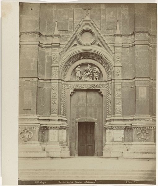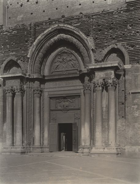 This photograph depicts the west portal of the abbey church of Saint-Gilles-du-Gard. Although the photographer is unknown, the print itself, a salted paper print, was a popular method for reproducing architectural details in the mid-19th century. The appeal of this photographic method was that it allowed for the mass production of images, making architectural marvels accessible to a wider audience. But let’s not forget the labor involved; each print required careful preparation of paper with silver nitrate and meticulous exposure. Here, the rough texture of the weathered stone is beautifully rendered. Note the intricate carvings of figures and foliage, and the way the light catches the surface. The photograph’s material qualities give the sculpture a tangible presence. Consider this image not just as a record, but as a testament to the intertwined histories of photography, architecture, labor, and art. It challenges the traditional hierarchy between the fine arts and other forms of creative production.