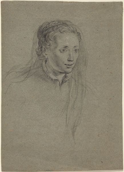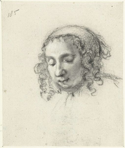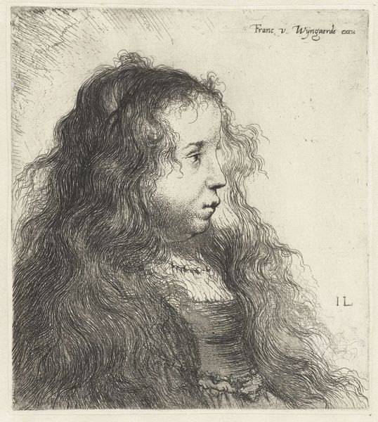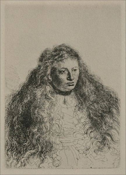 Curator: I'm drawn to this print from the early 1630s by Jan Lievens, entitled "Borstbeeld van een jong meisje met loshangend haar"—that's "Bust of a Young Girl with Loose Hair" for us non-Dutch speakers. It’s currently housed here at the Rijksmuseum. What strikes you immediately about it? Editor: She's absolutely swimming in hair! It’s like a visual waterfall cascading around her delicate face. It feels… vulnerable, almost as if she's hiding within it. Curator: The hair certainly commands attention, doesn't it? The symbolism of hair is rich throughout history; in many cultures, long, unbound hair represents freedom, youth, and untamed energy. Given Lievens’ mastery of light and shadow in this baroque etching, do you think this piece signifies pure innocence? Editor: Not necessarily. Look at the precise detail of her neckline, her controlled gaze. It hints at an inner resolve. That wild hair? Maybe that’s a facade, something carefully cultivated to present a specific image to the world. Plus, the slight downward glance speaks volumes; is it deference or defiance? Curator: That’s an interesting reading. Baroque portraiture often played with this tension – revealing as much as it concealed. Notice Lievens’ use of line – the stark contrasts defining her face, softened by the wispy texture of her hair. The work seems to draw upon the techniques and principles perfected by Rembrandt during this period. The two artist’s proximity in Leiden may also account for similarities in technique. Does that inform your sense of the piece? Editor: Absolutely. Rembrandt’s use of chiaroscuro definitely echoes here. What's amazing to me is how Lievens uses etching to suggest not just volume, but also the very texture of individual strands. It’s almost sculptural. The fact that the hair is so unkempt yet so elegant contributes to this strange combination of strength and shyness you mentioned. Curator: This detail also speaks to me. As you suggest, there's something incredibly human, almost unidealized, about her presentation here. The very conscious attention Lievens gives the minute detailing makes her simultaneously universal and particular. The history, medium, and artist combined almost require one to consider the piece. Editor: Yes, Lievens is drawing out that tension—we sense her power precisely because of the perceived disarray. Her face isn't classically beautiful, but compelling, almost enigmatic. You just want to know her story. Curator: Ultimately, what Lievens gives us, as always, is a moment suspended in time, a question lingering long after the viewing. Editor: Indeed!