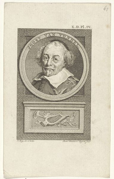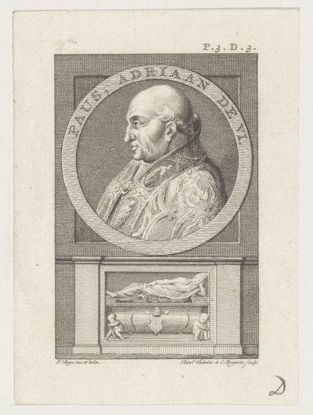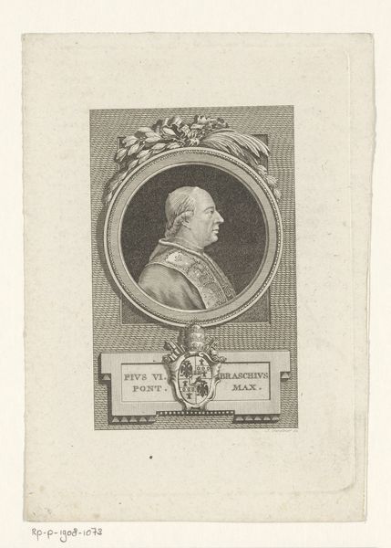Curator: Welcome. We are now standing before Christian Georg Schütz's 1776 rendering of Johann Baptist Amos, currently held at the Rijksmuseum. Editor: First impression? It’s all so…sepia toned, like a forgotten photograph rescued from an attic trunk. A portrait emerging from the mists of time, a very stern profile framed like a valentine! Curator: Indeed. What strikes me is how meticulously Schütz crafted this work. The cross-hatching is extremely intricate, and this portrait would have been created at a time when printed portraits of this kind provided status to both the giver and receiver. Editor: Those little details are fabulous, those leaves framing the image. Gives it a celebratory air almost like those paper cutouts. Curator: Portraiture at the time carried such cultural weight beyond mere resemblance. Patronage, artistic skill, status, all were reflected in its display. Editor: I love the inscription. Adds a whole other layer like uncovering secrets hidden within a scroll. The entire construction lends a sacred aspect to this image. He truly appears revered! It gives the subject this... immortality. Do you see that too, how time doesn’t really touch it? Curator: Absolutely. This reminds us that art's cultural significance is intertwined with its political and societal environment, from commissioning through public consumption. It encourages one to question its long-term significance. Editor: What a wonderfully wrought artifact, and such a treat for our ears to enjoy these conversations around it. Curator: A testament to the lasting impact an image can hold over centuries.