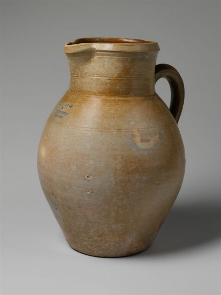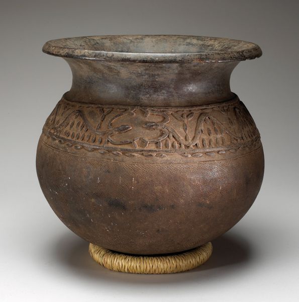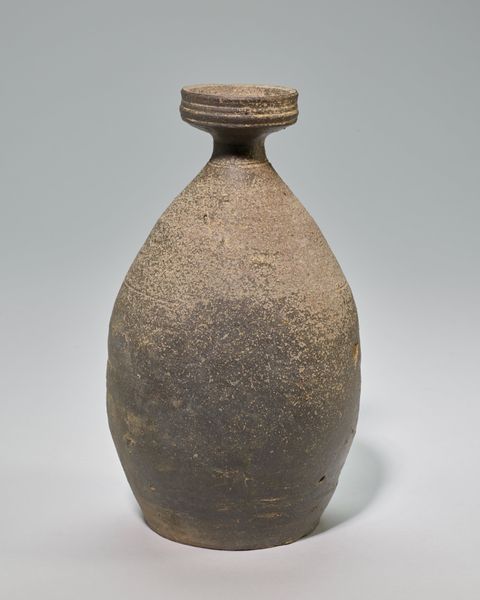 Editor: Here we have an ancient, anonymous jar dating from the 2nd century, made of earthenware. The surface is quite rough, but I find its shape harmonious and the textures surprisingly modern. How do you approach a piece like this, with its focus on pure form? Curator: I'm drawn to the interplay of geometric volumes and the rhythm created by the decorative bands encircling the neck. Note how the spherical body rests on a flared base, achieving a satisfying balance. One might say that it’s about the object and how the forms contrast, and complement, each other. Editor: Yes, the balance is beautiful. What do you think the material adds to the overall impact? Curator: The ceramic, with its muted tone and tactile quality, amplifies the object’s simplicity and timelessness. This unadorned material directs our focus to the vessel’s architecture: the curve of its belly, the tapering neck, and the subtle ornamentation of its surface. In many ways it distills the idea of "vessel" down to its elemental components. What would you say is the effect of the three symmetrical cut-outs on the flared base? Editor: Good question! Perhaps they play with the sense of groundedness versus airiness. It introduces negative space to that otherwise quite grounded section of the piece. It certainly gives us pause. I suppose a Formalist reading keeps the meaning internal to the art object itself, huh? Curator: Precisely. The jar provides an opportunity to explore the essence of form and material. Ultimately, it prompts a consideration of what constitutes a satisfying artistic design and its lasting impact on our senses and sensibilities. Editor: I appreciate seeing how the dialogue of different shapes, textures, and use of positive and negative space leads to understanding.