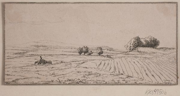 Editor: Here we have Louise Ravn-Hansen's "Dråby Mølle" from 1882, created using pen, ink and etching. The print presents a windmill situated in a field under a vast sky. The scene evokes a sense of tranquil, rural life. How might you interpret this particular landscape, considering its formal elements? Curator: The artist's compositional strategy is immediately evident. The horizon line, though present, does not dominate. Note how Ravn-Hansen orchestrates a careful balance between the weight of the lower field and the openness of the sky. The windmill is a visual anchor, wouldn't you agree? It draws the eye upwards, navigating through meticulously rendered lines, eventually arriving at the soft textures that create volume of the clouds. Consider the implications of her choice of materials, how the stark contrast of the ink generates a unique sense of depth. Editor: I see what you mean. The lines definitely guide your eyes across the landscape. But is it simply a recording of visual information? I mean, why choose this scene in the first place, as opposed to something else? Curator: I think the choice of subject reveals an interest in the aesthetics of everyday life and vernacular architecture. Ravn-Hansen presents a harmonious visuality via the composition. Her landscape becomes an exercise in formal relationships, almost transcending any representational objective. Notice how the careful hatching transforms fields and the sky. Editor: So, less about the actual place and more about how the elements come together. Curator: Precisely! I appreciate the interplay between form and technique and how, via ink, she captures a timeless essence of landscape. Editor: I'm now starting to appreciate how the formal elements construct the work's sense of place and depth through light, shadow, and compositional techniques.