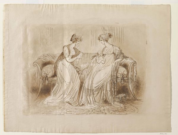Henry Moses created this print, "The Sewing Circle", using a technique called etching. It involves using acid to cut into a metal plate, which is then inked and printed onto paper. Here, the lines are delicate, almost like a pencil drawing. Notice how the act of sewing is central. It's not just a pastime, but a social activity, connecting these women. Their clothing suggests a comfortable middle-class status, able to afford leisure time and the materials for needlework. Consider the labor involved, both in creating the original clothing and linens and then mending and embellishing them. This was work often done by women in the domestic sphere. By showing this scene, Moses elevates a common, everyday activity to the level of fine art. He encourages us to consider the value of labor, the importance of community, and the artistic potential found even in the most humble materials and processes. In this way, the print challenges traditional hierarchies separating "high art" from the crafts of daily life.
