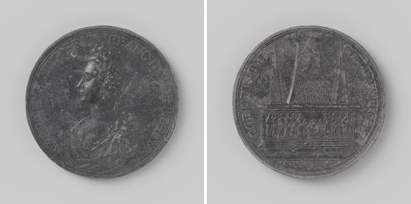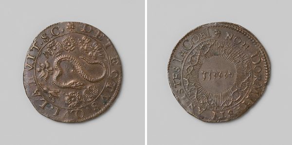 This is a small, anonymous coin, titled "Krijgstoerustingen in de Republiek." The circular form, made from a base metal, is worn with age, yet its engravings present a fascinating study in miniature design. One side shows a ship rendered with simple lines floating on stylized waves. The opposite side features a complex heraldic shield topped with a crown and surrounded by inscriptions. Structurally, the ship and the shield function as emblems of power and national identity, common in the visual language of currency. The choice of imagery and its execution reflect a culture deeply intertwined with maritime strength and economic ambition. The coin then becomes a symbolic object, speaking volumes about the values and self-perception of the society that produced it. Consider the physical qualities: its size, the baseness of its material, and how these elements invite us to reflect on the tangible and intangible values we assign to objects.