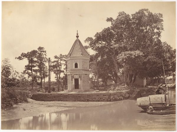Curator: This gelatin-silver print from 1864 by Samuel Bourne depicts the Shah-e-Hamdan mosque in Srinagar, Jammu & Kashmir, India. Editor: The stillness of the water, the monochromatic palette... there's a distinct sense of serenity evoked by this image, almost meditative. Curator: Bourne was known for his meticulous approach to landscape photography. The wet collodion process he used then was incredibly labour-intensive, requiring portable darkrooms and careful preparation in difficult conditions. Consider the logistics of creating this photograph in remote Kashmir in the 19th century. The very act of capturing this image becomes a testament to British imperial ambition and colonial administration in the mid-nineteenth century. Editor: Absolutely. And that context adds layers to the symbolism. Water, for example, often represents purity and transition in many cultures, and in an Islamic structure, that resonance amplifies. The mosque itself, how many similar structures are like this in the world? It seems to reach to the sky. I am particularly intrigued by the almost pagoda-like structure of the roof and how it rises up to that spire. It suggests cultural and religious dialogues over long periods. Curator: You know, looking at the materiality here - the timber construction of the mosque, reflecting in the water alongside simple boats - I am prompted to consider what that signifies for the local Kashmiri craftsmanship and access to resources. What specific types of wood were used? And who was responsible for that labor? Editor: I appreciate that focus. The photograph’s power lies not just in documentation but in the spiritual aura it conveys. How it depicts the sanctity of place. The light striking the mosque makes one think of the Divine Light often spoken about by mystics. The image appears to capture a moment where the physical and the spiritual meet in harmony. Curator: Examining how this photograph circulated and was consumed in Britain during the rise of colonial power offers insight into the orientalist lens through which Kashmir, and its artistic and architectural production, was viewed. What did the British imagine Kashmir to be, viewing these types of photographs? Editor: Interesting perspective. I've always viewed this particular image as a bridge across time, a reminder of the enduring spiritual quest. Curator: Well, my takeaway hinges on Bourne’s practice within the larger colonial framework, its techniques and subsequent circulation. Editor: For me, the quiet harmony of faith and place whispers. Thank you.