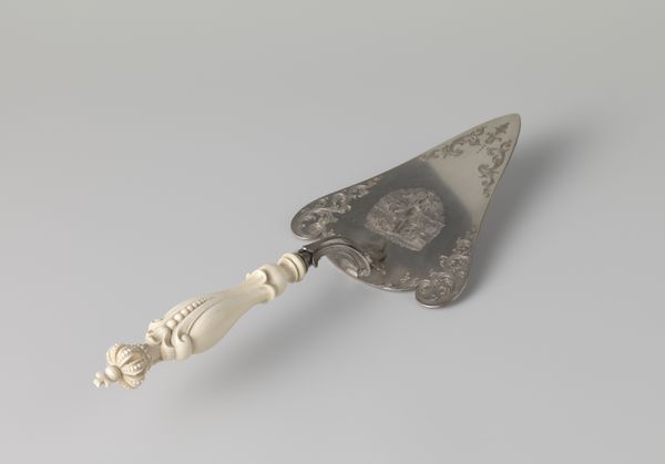 Here we see Carel Koekebakker's silver "Book Clasp with Ornament," a small yet intricately designed object. The clasp is broken into two parts, revealing its inner mechanisms and ornate decorations. The piece is dominated by its silver hue, which gives it a sense of coldness and industrialism. The decorative elements are based on curved lines, forming shapes within larger shapes, almost creating a visual puzzle that invites closer inspection. These small, detailed designs are set against the smooth surfaces of the metal, thus highlighting the contrast between simplicity and complexity. What might this contrast tell us about the nature of design and decoration itself? This clasp plays with the tension between functional necessity and the human desire for aesthetic embellishment. It reflects a broader cultural interest in how objects can communicate ideas about status, taste, and identity, making us consider the semiotic role of everyday items.