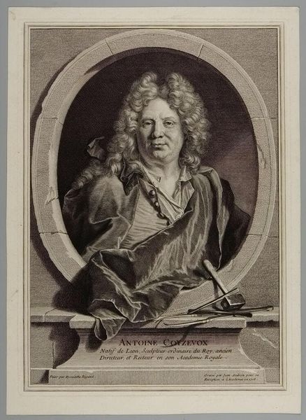 Curator: Here we have Jean Audran's portrait of Antoine Coysevox, currently held at the Harvard Art Museums. Look closely at the details of the engraving. Editor: My first impression is just how meticulously the artist captured Coysevox's personality! The textures of his wig and clothing seem to almost come alive. Curator: Indeed. Audran's work highlights the hierarchy of the royal court. Coysevox was a sculptor for the King and director of the Royal Academy; note how Audran’s composition reflects that status. Editor: I see what you mean, but it’s more than just status, isn't it? There's a sense of the artist's own creative spirit shining through. I love the placement of his tools—it speaks to the artistry on display here. Curator: Absolutely. By situating the tools within the image, Audran comments on the importance of artistic legacy and craftsmanship within 18th-century French society. Editor: I get a warm feeling from this image. It’s a beautiful testament to artistic dedication. Curator: Yes, Audran's work allows us to contemplate the intersection of art, power, and personal expression in the French Royal court.