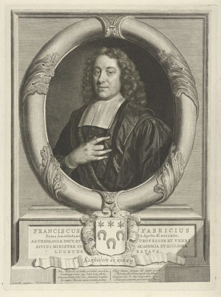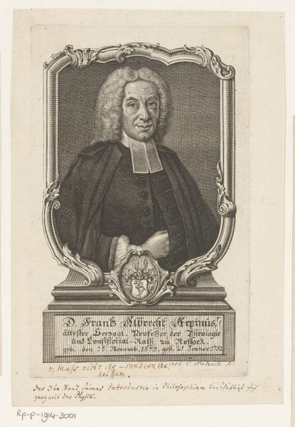 Editor: Here we have Tobias Laub's "Portret van Philipp Anton Laub" from 1744, a work rendered in engraving. It looks rather formal, and I am struck by how the print itself almost mimics the rigid structure of Baroque portraiture. How do you read this image? Curator: Consider the materiality. This isn't painting; it's engraving – a process involving skilled labor and mechanical reproduction. Look closely at the lines. They're not spontaneous gestures, but rather carefully incised into a metal plate, demanding precision. The "original" exists only as a matrix for endless copies. This challenges our conventional ideas about authorship and value, doesn't it? How does mass production change the value and audience of an artwork? Editor: That’s fascinating. It makes you think about who this portrait was *for*, and how readily available images were to those outside the upper class. Was printmaking viewed differently than painting at this time? Curator: Exactly! Printmaking allowed wider circulation, embedding this image in social networks. The inscription and Laub’s clerical attire, too, situate the print within specific cultural and religious contexts. Note the inscription's reference to enduring merit, achieved not through birth, but through intellect. What statement is being made here about achievement and status in this moment? Editor: I hadn’t considered how the method of production shaped the social purpose. The intellectual achievement through a repeatable artform! Thank you, I've certainly gained a richer understanding of this portrait and the impact of materiality. Curator: And I find myself considering anew the democratization of imagery within these elaborate Baroque conventions.