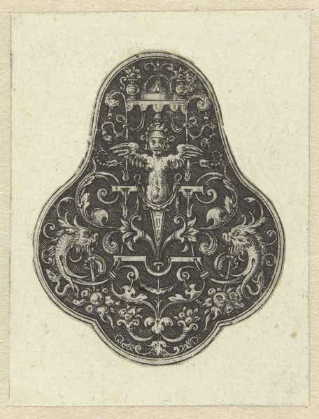 Curator: Look at this intaglio print titled "Pendant Design with Judith Holding the Head of Holofernes," a work by Johann Theodor de Bry, dating to around 1580 to 1600. Editor: My initial thought is one of formidable strength despite the delicacy of the engraving; there's an empowering defiance etched within the small piece. Curator: Absolutely. The meticulous technique here is remarkable—look at the layered details achieved through engraving! Each element, from the ornamental scrollwork to the figural depictions, has been meticulously considered in the process. Think about the labor invested, the skilled hands that cut into the metal to produce the design. And of course, this was a reproductive print intended to be widely disseminated for craftsmen in precious metalworking! Editor: It's such a potent choice for a pendant; I'm drawn to Judith's central positioning and of course the statement her act of courage represents, it also becomes a clear statement of female empowerment, especially given the history of how that has played out, from a jeweled artifact into an act of strength to fight back. Also it cannot go unnoticed that Judith isn't simply displaying the head of Holofernes, it's raised and wielded almost as one would wield a sword; which may signal that gender plays no rule in courage! Curator: Exactly! The Mannerist style really emphasizes ornamentation but beyond that, think about the commercial networks involved here, how such a relatively portable piece could disseminate ideas and images, contributing to dialogues about style and gender! It is a great demonstration on the interplay between artistic expression and social production that highlights just how important this historical reference to such acts as what Judith committed is, while on display. Editor: So very true, I imagine its circulation allowing the spread of challenging ideals, questioning prescribed gender roles. What begins as craft ends up embodying rebellion in ways we're still uncovering. It’s about reclaiming agency within a rigid social hierarchy! Curator: Agreed, reflecting on its craftsmanship illuminates both its aesthetic achievements and the broader social fabric it inhabited. Editor: I find myself even more invigorated by that defiant spirit made even more impactful through understanding its historical positionality and intended audience.