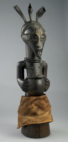 Editor: This wooden sculpture, titled "Male Figure," is attributed to the Hemba people, dating back to the 19th or 20th century. I’m immediately struck by the figure's rigid, almost columnar form. How do you approach interpreting a piece like this? Curator: From a formalist perspective, the sculpture invites an analysis of its internal structure. Consider how the artist has employed geometric forms. Notice the cylindrical torso and the ovoid head. The composition hinges on verticality, contributing to its imposing presence. Editor: I see what you mean about the geometric forms, particularly the cylinders making up the neck and torso. Do you think the simplified forms take away from the representation of the figure? Curator: Not at all. Rather, the abstraction invites a consideration of volume and mass. Observe how the arms, though simplified, echo the central cylindrical form. Semiotically, we might also ask how the negative spaces around the limbs and between the legs activate the overall design. The dark patina also obscures the figure slightly adding a sense of mystery to the work as the dark medium absorbs the light. Editor: That’s interesting. The patina does unify the elements and draw you into the form. It sounds like you’re saying the beauty resides not in accurately depicting the male form, but rather in the interplay of shapes and voids? Curator: Precisely. This sculpture functions as a study in form and balance. The reduction of detail necessitates that we engage with the fundamentals of sculptural language: mass, line, and volume. Editor: I’ve learned a great deal. Focusing on form truly unlocks a new dimension in this artwork. Thanks so much for the formalist breakdown. Curator: Indeed. Through such analysis, we may see beyond the superficial and connect more intimately with the artistry on display.