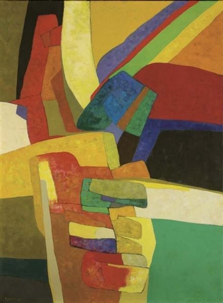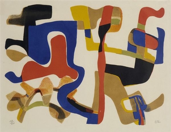 Maurice Esteve made "Andalousie" with paint on canvas, and what grabs me first is the way he fearlessly lets color lead the way. It's like he's saying, "I trust this orange, this yellow, this blue." Look at how the colors bump up against each other; they don't quite mix but hum with energy. The shapes feel like they emerged from a playful wrestling match with the paint itself, each blob and line a testament to the joy of process. Take that snaking, burnt-orange line that travels from the bottom right. It’s almost cartoonish, yet it firmly anchors the composition. Maybe this playfulness comes from Matisse, who let shapes find their voice. This painting feels like a celebration of not knowing exactly where you're going but enjoying the journey nonetheless. It shows how embracing ambiguity can be its own reward.