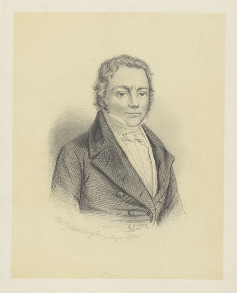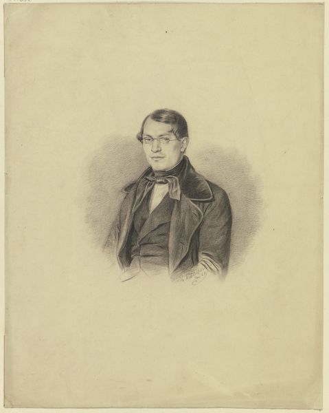 Curator: Here we have Coenraad Hamburger’s "Portret van James de Rijk," a pencil and graphite drawing created in 1841. Editor: My initial thought is elegance and precision. There's something about the delicate shading that feels very refined, almost like looking at an engraving rather than a simple pencil sketch. Curator: It certainly speaks to the conventions of portraiture in that era, doesn't it? We see echoes of Romanticism in the idealized features, but also a dedication to accurate representation expected within the artistic and societal parameters of Academic Art at that time. Consider who James de Rijk was—undoubtedly part of a social class that expected to be portrayed in a particular way. Editor: And I’m drawn to the craft itself. Notice the way Hamburger renders the fur collar, those controlled lines creating such tactile depth. You can almost feel the difference in texture between the velvet and the smoother fabric of his coat. One thinks about access to these materials, who could afford them, and thus, be memorialized in such a way. Curator: Absolutely. It points to the commodification of artistry—portraiture became a service offered to those who could pay. But the quality suggests Hamburger was also elevating the status of drawing itself. He wasn’t merely copying; he was interpreting and adding his artistic voice. The institutions of the time surely recognized and valued the skills that such precision and detail required. Editor: Do you think the precise shading suggests this may have been a preliminary sketch, used for reproduction through engraving later on? These were sometimes commissioned to be spread more widely... the image became another kind of commodity. Curator: That's entirely possible, especially given the level of detail. The relatively understated background keeps the focus squarely on James de Rijk himself, directing the viewer's attention to his social standing. Editor: Seeing the way in which the work memorializes both subject and maker – from the pencil lead, to the sharp wit, all combined, it makes you contemplate the role of labor in constructing visual narratives. Curator: Precisely, and by understanding that social and artistic context, we can really appreciate the subtle statements embedded within this portrait. Editor: Indeed, it’s fascinating how materials and artistry intertwine with social history here.