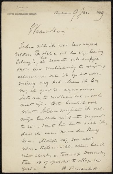 This is "Brief aan Cornelis Gerardus 't Hooft," a handwritten letter by Jan Veth from 1903. Veth used ink on paper, humble materials, yet his mastery lies in the act of writing itself. The flowing script, with its unique rhythm and pressure, is a testament to Veth's hand and mind. Consider the labor involved, the focused attention and the sheer amount of time it took to create such a letter. It is a physical manifestation of thought and care. The choice of a simple medium speaks to Veth's values, placing emphasis on the content and the connection with the recipient, rather than on ostentatious displays of wealth or skill. Through its material simplicity, the artwork embodies a directness and sincerity that transcends the traditional boundaries of fine art, inviting us to consider the value of human connection in an increasingly industrialized world.