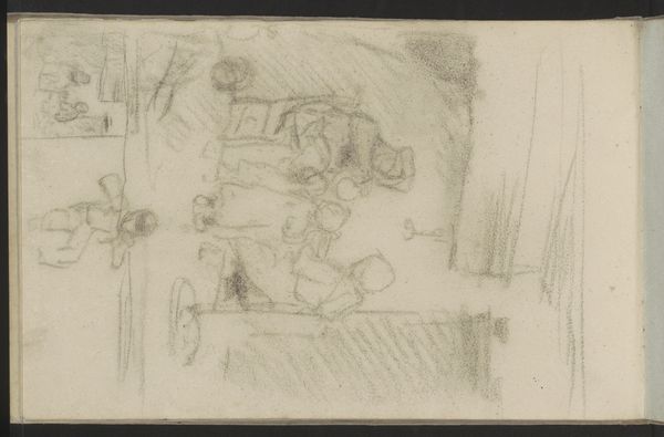 Curator: Just a quick sketch, but even so, it speaks volumes. What do you make of it? Editor: It feels melancholy, somehow. Sparse and haunting. As if figures are fading back into the earth they walk upon. Curator: Here we have Willem Witsen's "Landschap met figuren, mogelijk boeren," a pencil drawing made circa 1884 to 1887. You know, for an Impressionist landscape, it's intriguingly spare in its detail, isn't it? Editor: Absolutely. The lines are almost ghostly, ephemeral. Notice how the composition guides your eye to the figures, yet they lack a clear definition. They seem almost incidental, blurred into their surroundings. Curator: Exactly! Witsen focuses on capturing a fleeting moment, an impression. The solidity of the figures is irrelevant, really. More crucial is the mood evoked, the quiet contemplation, and that light playing on the planes in the field. Editor: Light becomes substance, in a way. He’s reduced form to its most fundamental components, and the empty spaces vibrate with as much importance as the pencil strokes themselves. Semiotically, this approach conveys transience, the dissolving of forms and a meditation on ephemerality. Curator: True! And the lack of clear detail allows viewers to project their own narrative onto the work. Are these laborers resting, or just passing through? There's a beautifully unsettling ambiguity about their purpose. They appear as simple shapes but resonate with the human story behind the landscape. Almost as if they don’t want to be bothered and would rather remain lost in their land. Editor: Indeed, its very vagueness makes the viewer a collaborator in its final meaning. Perhaps that lack of finality reflects how Witsen saw his own artistic trajectory at the time. A pathway with options still under consideration. Curator: Beautifully put! So, it appears that even within this fleeting, incomplete sketch, there are deep insights that can reveal themselves if you allow the art to whisper its mysteries. Editor: Well said. A ghost landscape with tales aplenty still to reveal.