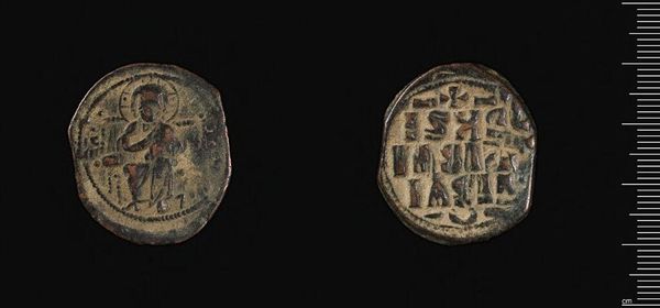 Curator: This is an Anonymous Follis, a coin residing here at the Harvard Art Museums. What do you see first when you look at it? Editor: Its worn texture speaks of use and exchange, embodying a history of labor and economic interaction. Curator: Precisely! The obverse depicts Christ enthroned, while the reverse bears an inscription. Notice how the composition divides the coin into distinct zones. Editor: The iconographic symbolism merges with the material reality. How did its production influence Byzantine trade networks? Curator: Its standardization aided that trade. One could focus on the visual elements—the figure, the script—or consider how its materiality shaped social practices. Editor: Exactly. Both the aesthetic and the socioeconomic dimensions inform our understanding. Curator: Indeed, a fascinating interplay between form and function. Editor: A small object with large implications.