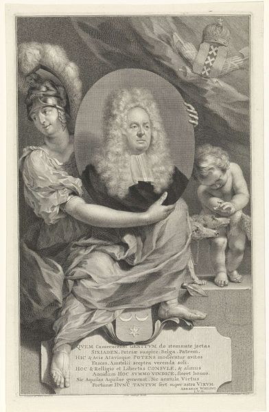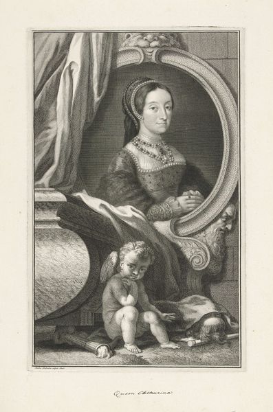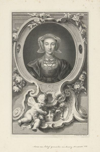 Curator: Welcome! Here we have Jacob Houbraken's 1745 engraving, "Portret van Sarah Churchill, hertogin van Marlborough," residing in the Rijksmuseum. Editor: My goodness, that gaze! Regal, yes, but there’s something slightly… weary in her eyes. And those cheeky little cherubs, pulling at the frame—almost feels irreverent, doesn't it? Curator: Houbraken was known for his meticulous engraving technique. Note the intricate rendering of textures, from the silk of her dress to the delicate curls of her hair, all achieved through precise lines on the copper plate. This meticulous approach aligns with the material demands of portraiture production in the 18th century. Editor: Absolutely! You can practically feel the smoothness of the paper and the way the ink must have bitten into it. Speaking of production, consider Sarah Churchill herself! A woman of immense wealth and power during the baroque era. Curator: Precisely! Her status profoundly impacted her material circumstances and image. Commissioning an engraving like this was a way to solidify her legacy, controlling her image’s circulation and consumption. Editor: Oh, certainly a carefully managed presentation of power. All those little details matter, don't they? But behind it, I sense… well, perhaps it's just the etching’s monochrome, but there is an air of melancholy woven through those fine lines. A world-weariness only suggested perhaps through an economy of details! Curator: It also speaks to the relationship between artisan and subject in that period. Consider the labor invested versus the financial means needed to participate as a consumer. It sets up so many dichotomies worth considering. Editor: That's interesting, you're so right, thinking of it like that, through production and money. Well, Jacob and Sarah have certainly given us much to contemplate. Curator: Indeed! Hopefully our discussion has provided a new perspective on this complex and beautifully executed piece.