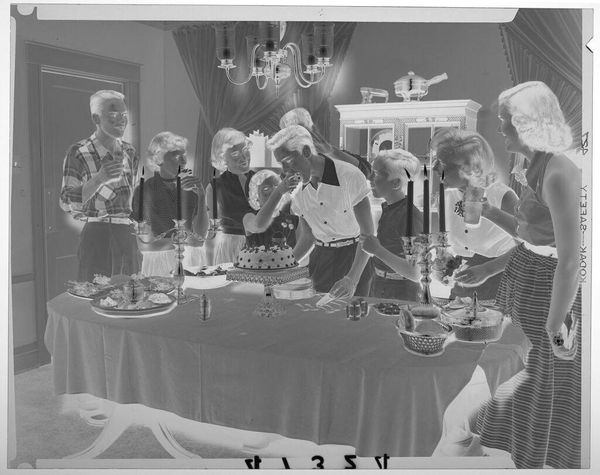 Curator: Here we have an untitled photograph by Martin Schweig, currently held at the Harvard Art Museums. It depicts a wedding gift table inside a brick room. What are your initial thoughts? Editor: My first impression is one of abundance and tradition, yet the black and white tones lend it a stark, almost ghostly quality. There's a tension between celebration and… something else. Curator: I see what you mean. The sheer volume of gifts does feel a bit overwhelming, doesn't it? It makes you wonder about the societal expectations around marriage and consumerism. Editor: Exactly. And who benefits from all this accumulation? It raises questions about gender roles, the economic pressures of starting a life together, and the performance of wealth. It's more than just a snapshot of gifts. Curator: Absolutely, it’s a complex image, prompting introspection about the rituals we blindly participate in. Editor: I think it highlights how even personal moments are deeply embedded in social and economic structures.
