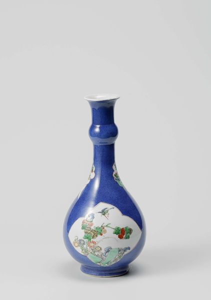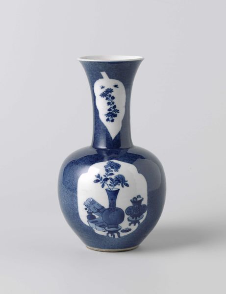 Curator: It's remarkable how something as functional as a vase can become such a poignant expression of culture. This piece, titled "Bottle vase with powder blue, antiquities and precious objects," dates back to sometime between 1700 and 1724. Editor: My first impression? Utter tranquility. The cobalt blue is just so enveloping, almost like gazing into a still pond. And the scene depicted feels like a little world contained, quiet and refined. Curator: The artist remains unknown. But what we do know is that it’s currently held in the collection of the Rijksmuseum, made of ceramic and offers a peek into the Chinoiserie craze that swept through Europe at the time. It’s a delightful collision of cultures, really. Editor: Precisely! The "antiquities and precious objects" are coded with symbols and class. There's a conscious dialogue happening between East and West, loaded with privilege. This form of display was aspirational. Curator: You know, what strikes me is how contemporary the color feels. Even centuries later, it still holds this power to capture the eye, a calming quality almost. Editor: Yes, but let's remember who could afford such exquisite beauty back then. These objects spoke volumes about status and the means of cultural appropriation during a period defined by colonial expansion. This piece embodies unequal exchange. Curator: Absolutely, these objects were certainly embedded within the unequal power structures of its era. Although it is gorgeous to look at and demonstrates the beauty that can come from intercultural artistic exchanges, they still exist as beautiful markers of history. Editor: Right, this ceramic bottle serves as a critical mirror, reflecting back the complexities of desire, privilege, and intercultural dynamics, inviting us to consider the stories behind the object. Curator: Exactly. Next time I see a blue and white vase I won't just be thinking about its beauty but everything that went into creating it and how much it means in cultural contexts. Editor: And that's precisely the tension and allure: a seemingly simple, beautiful object holds layers of histories. We are forever implicated by the artwork when it has roots in colonialism.