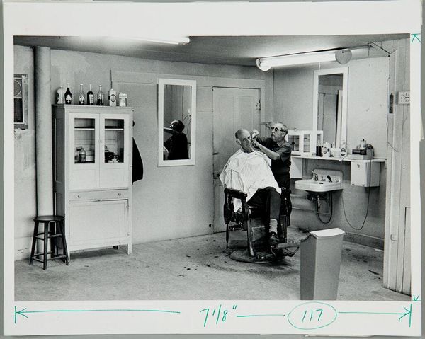 Editor: This photograph, "Untitled (nurse examining woman sitting in reclining chair in corner office)" by Martin Schweig, shows a nurse examining a patient. It's a very clinical scene, yet also intimate. What can you tell us about the context of this image? Curator: This image, with its setting in what appears to be a workplace corner, speaks volumes about the evolving role of healthcare and its accessibility. The nurse's uniform, the equipment, and even the posters on the wall reflect a specific era and its approach to public health. How do you think the setting influences our understanding of the relationship between the nurse and patient? Editor: I guess it feels less personal and more institutional. It makes me wonder about the social dynamics at play. Curator: Exactly. The photograph highlights the intersection of public health initiatives and individual experiences. Thinking about the time it was taken, how might social and political factors have influenced the scene depicted? Editor: That’s given me a lot to think about regarding the public face of care. Curator: Indeed. It provides insight into how health practices were normalized and integrated into everyday life.
