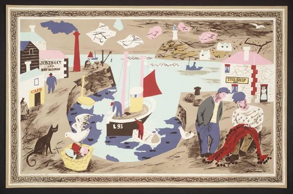 Curator: This is Jean David's "Boats of Jewish Immigrants (Hamaapilim)," a watercolor painting from 1948. Editor: It feels immediately… dreamlike. The colours are muted, and the shapes are soft. There’s a sense of nostalgia clinging to those boats, like they're fading memories. Curator: Observe the deliberate construction of the composition. The artist uses a limited palette, dominated by pastel yellows, greens and browns, to create a flattened picture plane, eschewing traditional perspectival depth. Editor: Flatness is right! The ships become abstract forms more than literal depictions. But the water... the way those blues and greens curl around the hulls gives such an undeniable sense of movement, and, surprisingly, turbulence. Curator: Precisely. While the painting's figuration nods to landscape, it reduces elements to geometric forms, emphasizing the structural elements over representational accuracy. The ships, rather than being realistically rendered, function as shapes interacting with the space around them. Editor: It’s interesting you bring that up, because despite the abstraction, the emotion is potent. To know it represents immigrant ships... there’s hope but also vulnerability rendered beautifully. The artist’s colour selection adds so much poignancy. The gentle hues, while visually appealing, also speak to displacement and impermanence, which enhances the painting’s emotional message. Curator: We could also analyze the tension between the foreground and background through structural oppositions, where organic forms meet rigid geometries to produce affective qualities. Editor: In less academic terms, it's got this push-pull between clarity and obfuscation that perfectly encapsulates the immigrant experience, right? A dream of arrival, yet a reality still to be shaped? It resonates in ways I can barely articulate. Curator: An astute interpretation. In summary, “Boats of Jewish Immigrants” operates as both a historical document and an aesthetic achievement. Editor: Leaving us with more than just visual delight, I feel the artwork has tapped into some deeper truth here. Powerful.
