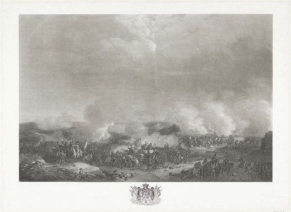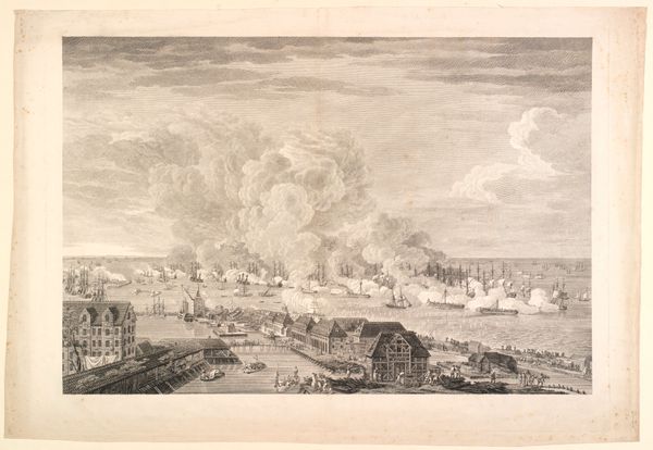 Curator: At first glance, this engraving feels both desolate and dramatic, wouldn't you say? The stark blacks and whites against a clearly turbulent sky...it pulls you right in. Editor: It certainly does. We're looking at Reinier Vinkeles’ "Kruiend ijs bij Tiel, 1799," made somewhere around 1799 and 1800. This work, currently residing here at the Rijksmuseum, captures a frozen moment—literally and figuratively—in the Dutch landscape. Curator: Yes, and there's a stark beauty in that frozen chaos. The jagged ice floes piled against the town…it's like nature staging a siege. The sky is especially captivating, almost alive, swirling with a menace that contrasts the stillness of the buildings. I imagine the townspeople felt rather small beneath all that bluster! Editor: Indeed, that juxtaposition is precisely what lends the work its power. Vinkeles, known for his detailed cityscapes and historical prints, often aimed to depict not just places, but their social and political circumstances, too. Images like this spoke to the Dutch Republic's vulnerability. Curator: Makes me shiver just thinking about it. Editor: Notice the composition, too? The town itself seems rather stoic despite the icy encroachment. The architectural lines are so crisp and clean, offering a kind of rational order against the natural pandemonium. Vinkeles might have been channeling the spirit of neoclassicism. Curator: The light in the picture is intriguing, almost spiritual; notice how the sun highlights parts of the city making you feel at ease. The people portrayed walking on the right must have thought twice. Editor: Definitely! This print is not merely a picture of an ice storm, is also a time-capsule for those of us who were not there, a moment of ecological and social awareness frozen in time by Vinkeles’ sharp eye. Curator: Beautifully said! And isn't that what art, at its best, should do? Illuminate not just the scene before us, but the hidden corners of the human experience as well?